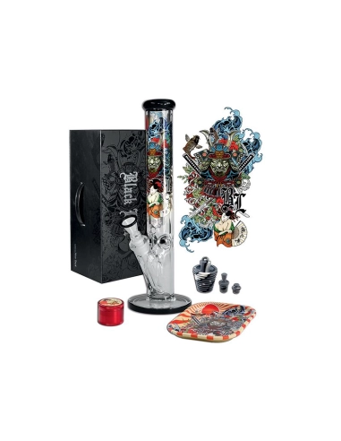 Megacooles Bong-Set von Black Leaf® mit exklusivem 'Ronin & Geisha' Design made by Sly! Da hat sich Sly mal wieder selbst übertroffen: Das ohnehin ausdrucksstarke und stylische Japan-Motiv mit dem herrenlosen Samurai, Geisha, Koikarpfen und aufgehender Sonne.