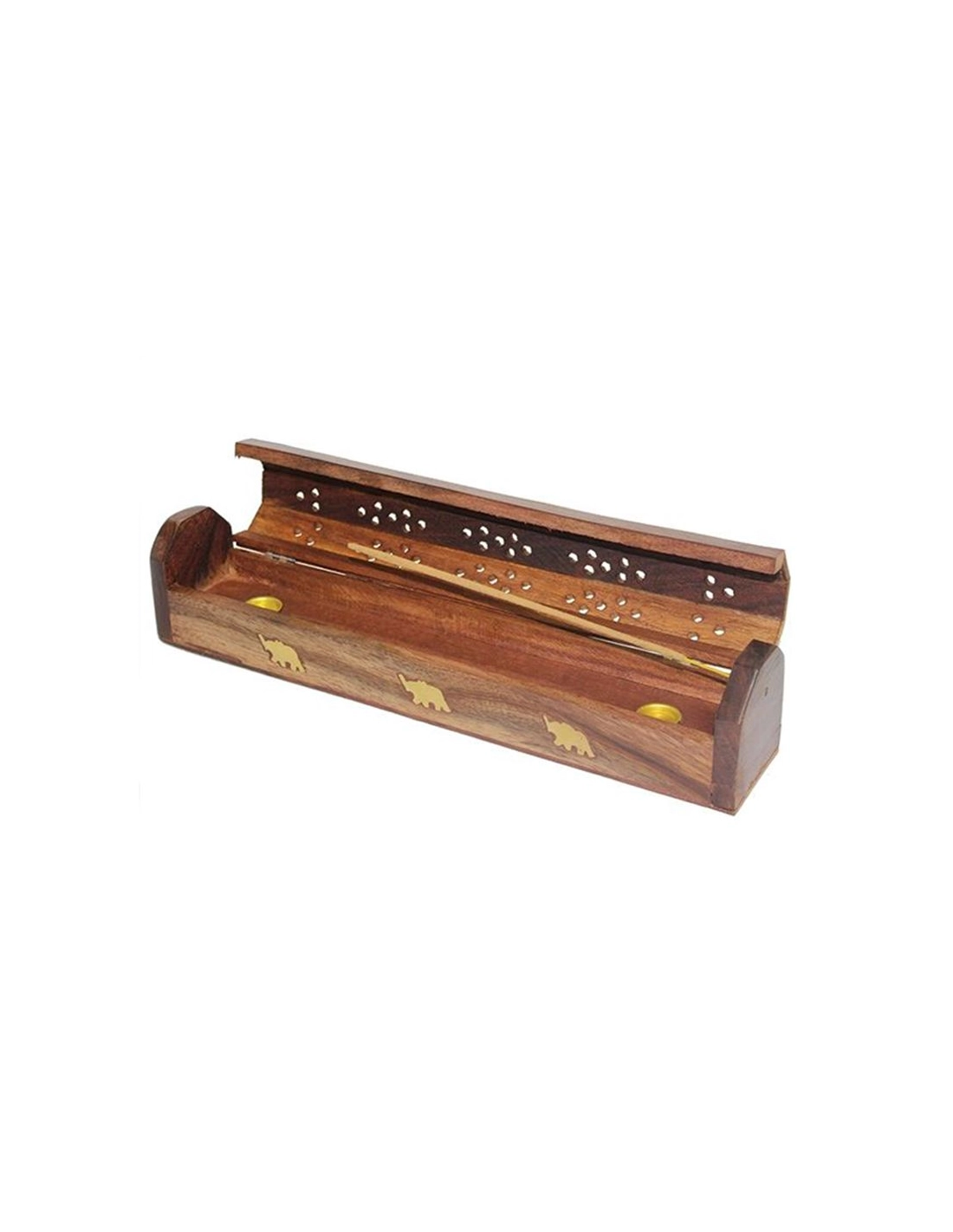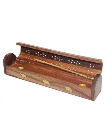 Räucherstäbchenhalter aus Holz mit Deckel mit goldenen Verzierungen, die Elefanten darstellen. In diesem Halter können sowohl Räucherstäbchen als auch Räucherkegel verbrannt werden.