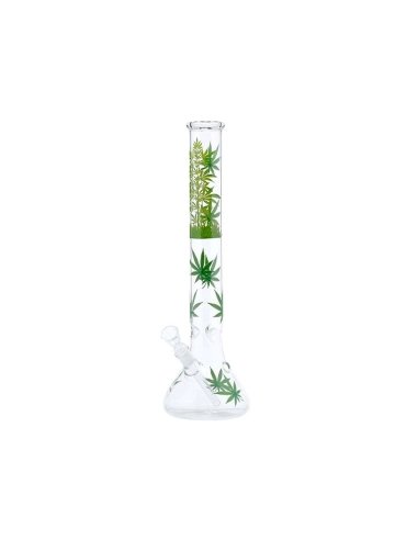 45 cm hohe Glasbong mit Cannabisblättern auf der Oberseite. Die Brennkammer, in die du dein CBD gibst, hat einen Durchmesser von 18,8 mm, was dir einen luftigen Zug ermöglicht.