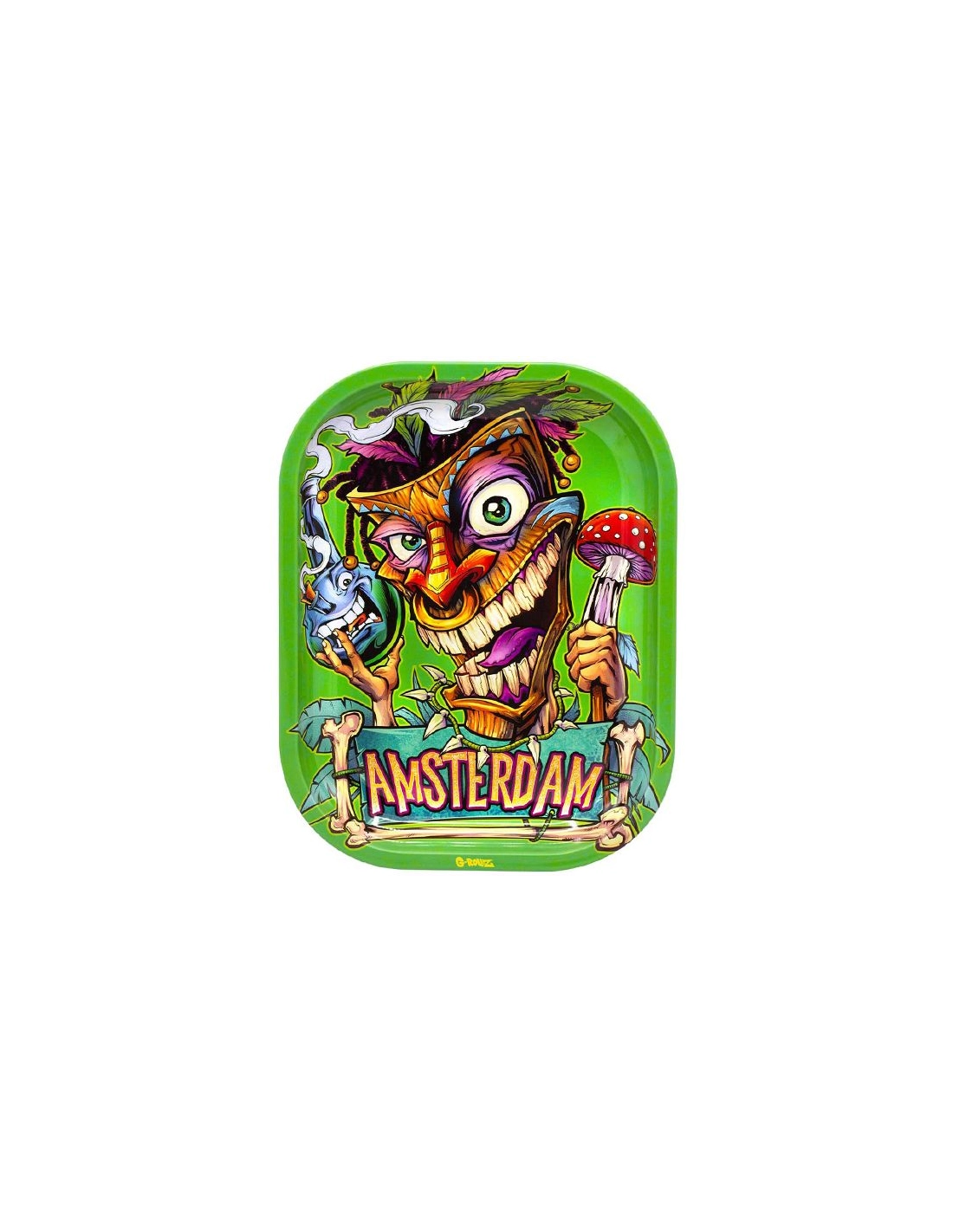Grünes G Rollz Metall-Mix-Tablett mit dem Bild einer Kreatur, die eine Wasserpfeife und einen halluzinogenen Pilz hält, mit den Maßen 14 x 18 cm und abgerundeten Kanten.