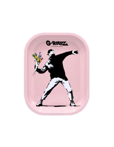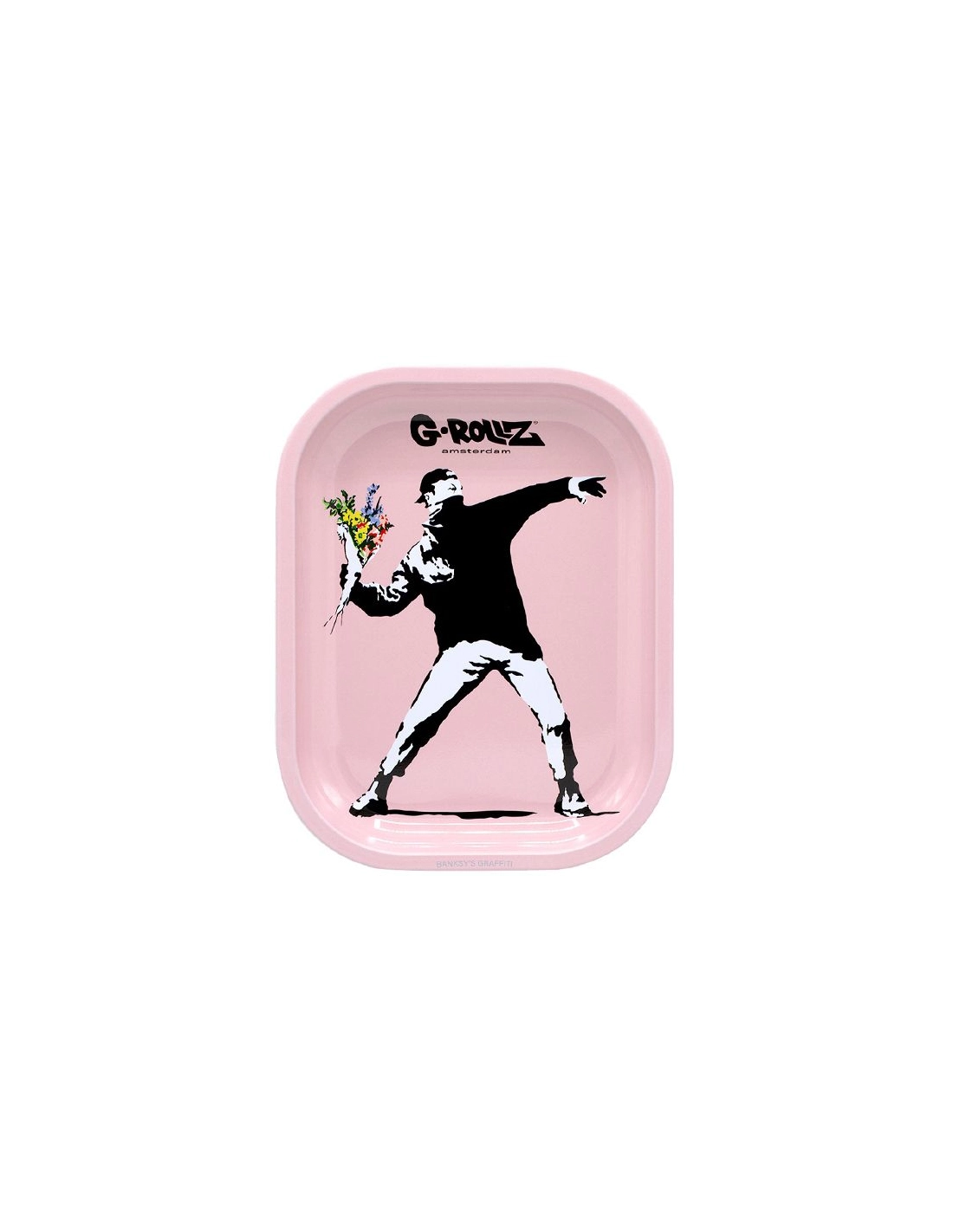 Mixtablett aus Metall mit einer Größe von 14 x 18 cm mit dem Bild eines Banksy-Kunstwerks, das einen Demonstranten zeigt, der einen Blumenstrauß wirft.