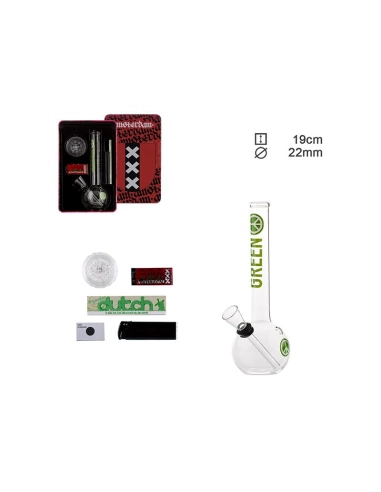 Geschenkset mit einer 19cm hohen Bong und Zubehör, ideal zum Rauchen deiner Lieblings-CBD. Diese Bong verwendet einen Feuerraum mit einem Durchmesser von 14,4mm und einer Dicke von 3mm.